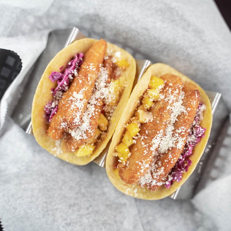 Savor the extraordinary with our Crispy-Coated Chicken Taco. Revel in the succulence of breaded chicken strips, red cabbage slaw, mango salsa and PJK Sauce all impeccably nestled in warm tortillas.